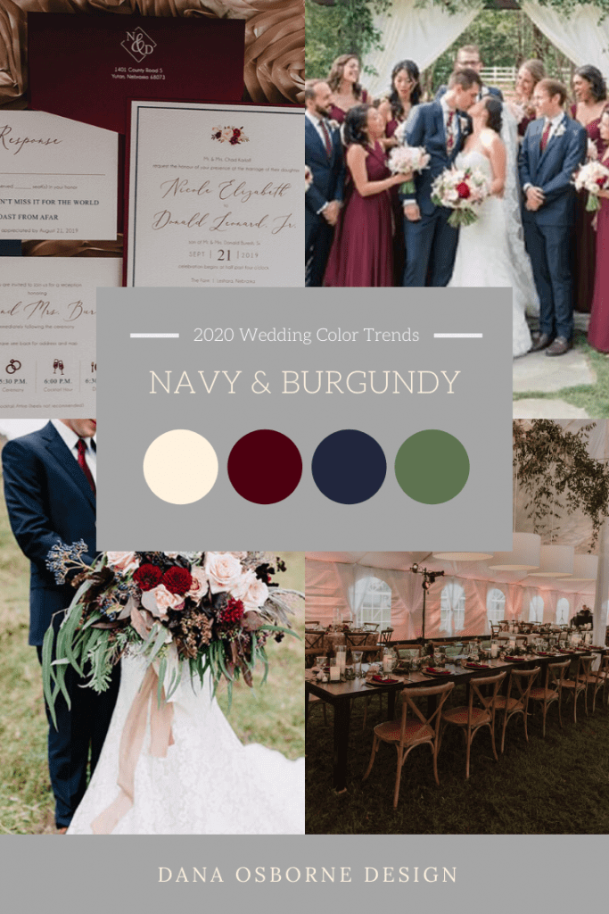 Burgundy with Navy is sticking around for 2020. I've worked with this play on colors in 2019 and a bit in 2018, but I'm seeing it more for this coming wedding season. The bold colors paired with loads of greenery and blush is classic and beautiful.