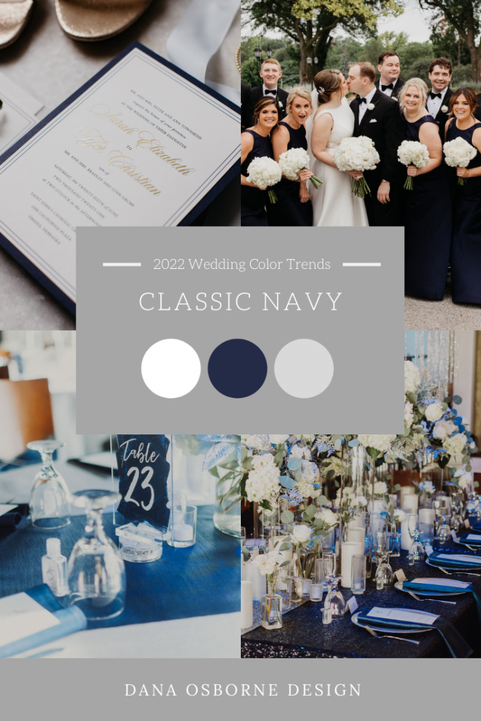 For wedding invitations, I love substituting black for navy wording color on and invitation. Navy envelopes are a great punch of color too that stand out in the mail. Pair some gold foil with the navy and you have classic to the core.