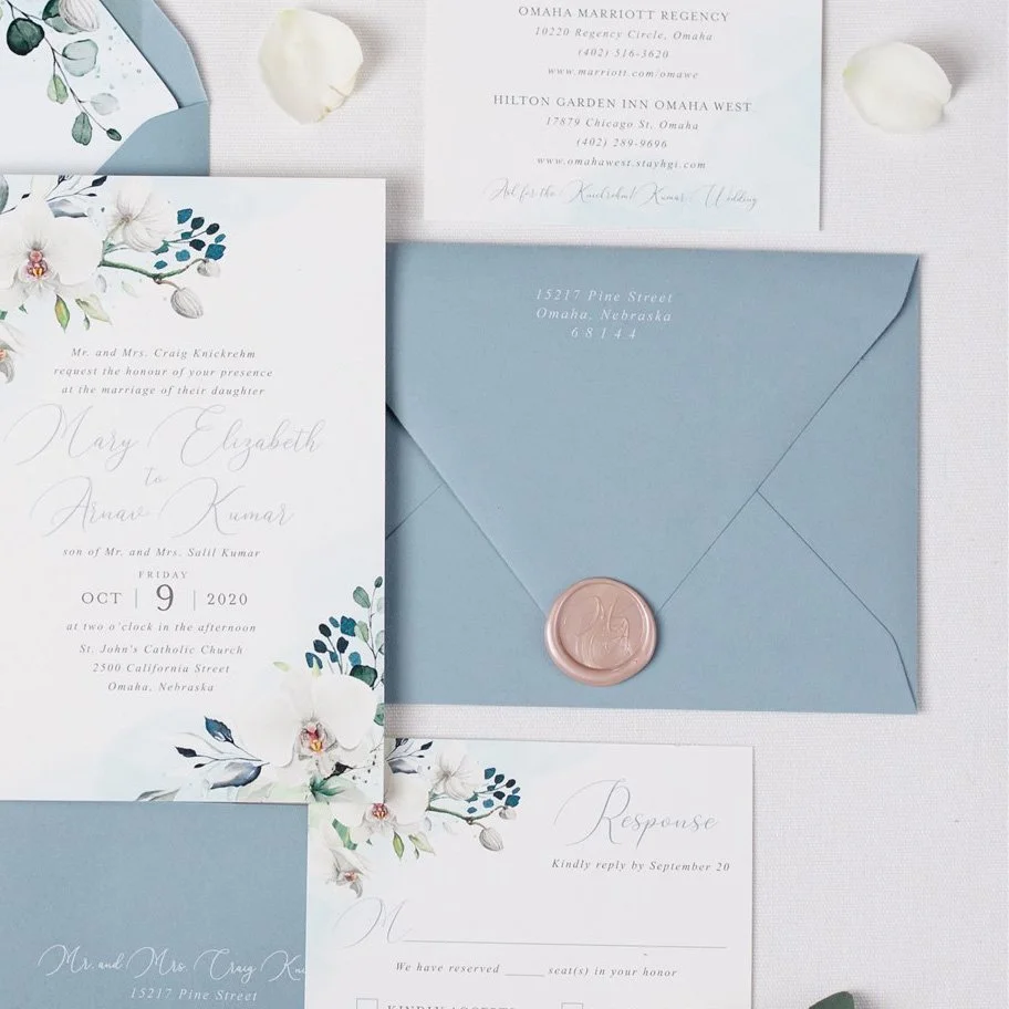 Wax seals are seen as a classic touch to wedding invitations. They were super popular with older wedding invitations and have recently made a comeback as a must have with your invitation package. Wax seals are not only classy, but they're fun. Wax comes in a variety of colors, so you can coordinate your wax seal with your wedding style.