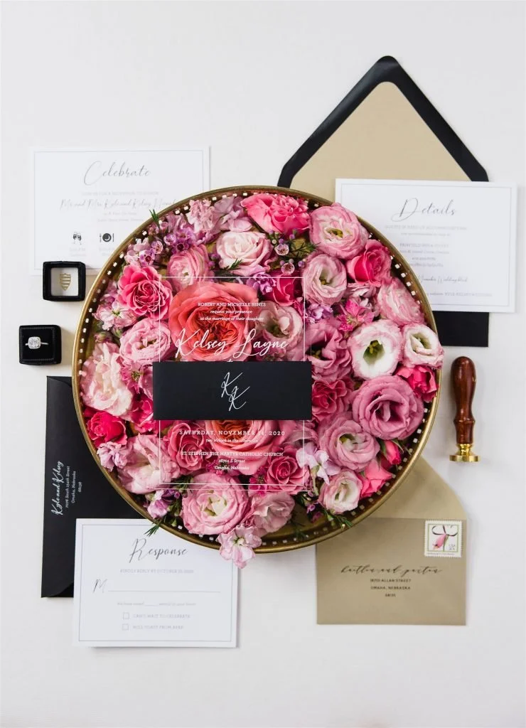Of course I didn't. Knowing we were on a tight timeline (like everyone last year), I made that call. And they were very understanding. Like, nice about it. Ultimately, I wanted to make things right and make their invitations perfect. So with a few extra days, I was able to reprint acrylic invitations and overnight them to myself, so I can secure the belly band in place and complete the package. Because this couple was so understanding, I made sure to stuff all the envelopes too so they were ready to seal and get to the post office.