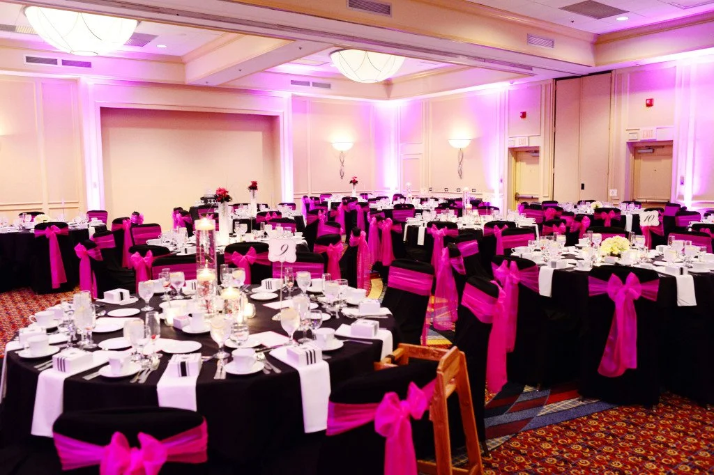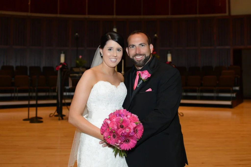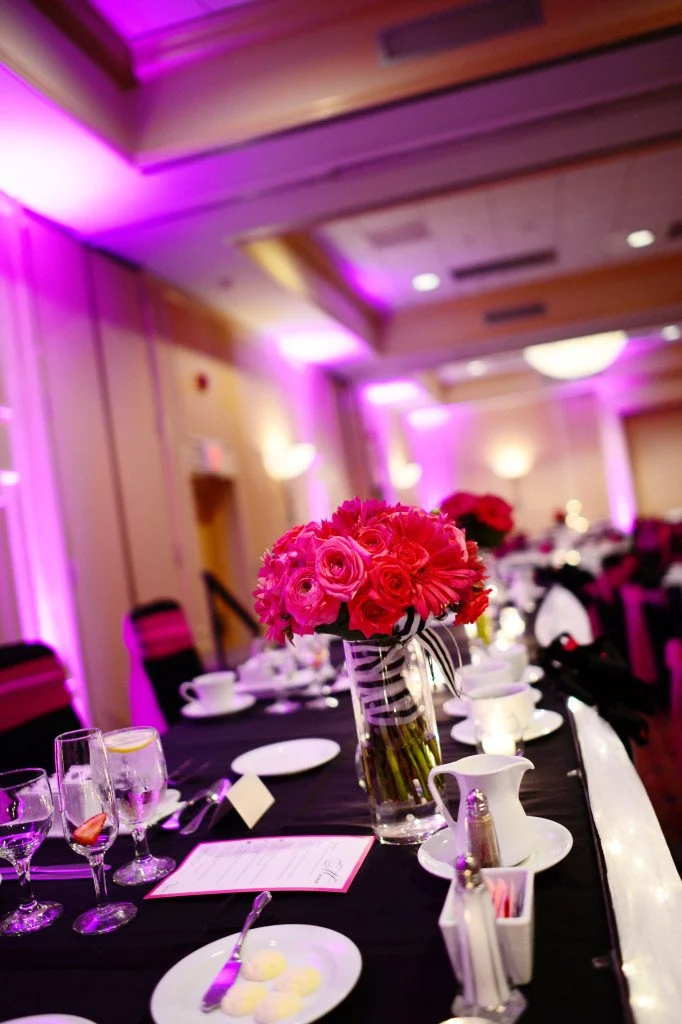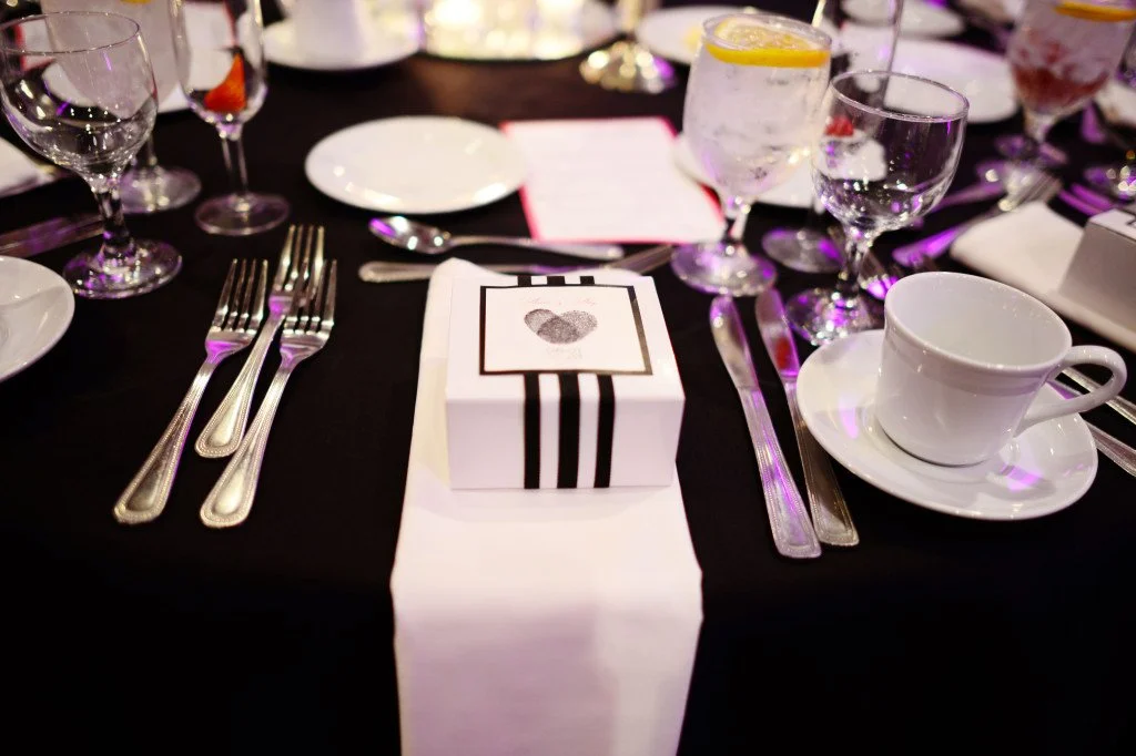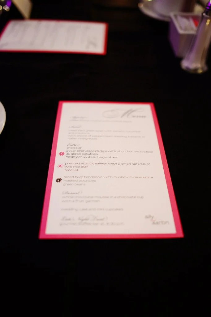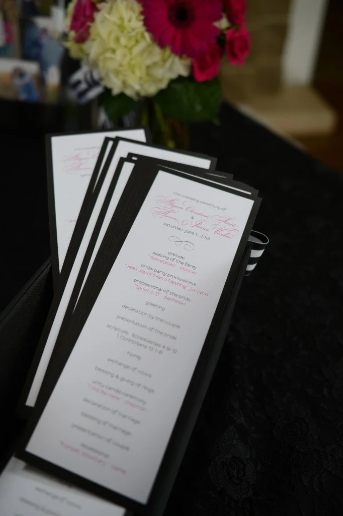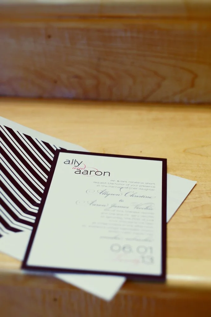 I was spoiled to see Ally and Aaron's wedding photos which included a shot of the invitation. Not going to lie, I got a little gitty. I've never had my invitations shot professionally before and this may have convinced me to get this done for each bride and invitation I create. The details of this wedding were fabulous. Ally's black and hot pink stood out in every instance and we created some very custom pieces, such as the favor sticker (thumbprints), water bottle labels and menu that helped make this happen.