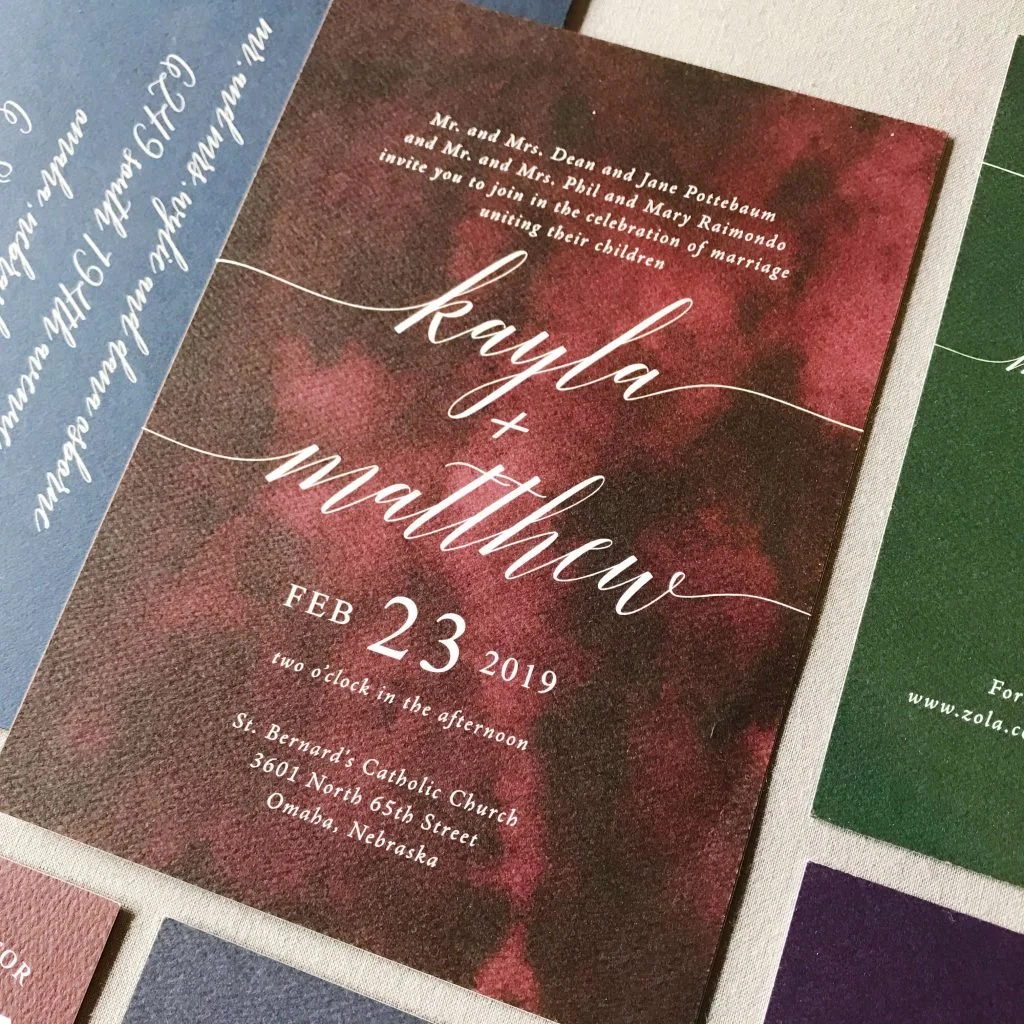As for this couple's style, I was excited to give Kayla and Matt beautiful, dark jewel tones in their wedding invitations. After doing so much light blush and gold the past few years, the dark, moody colors were welcome.