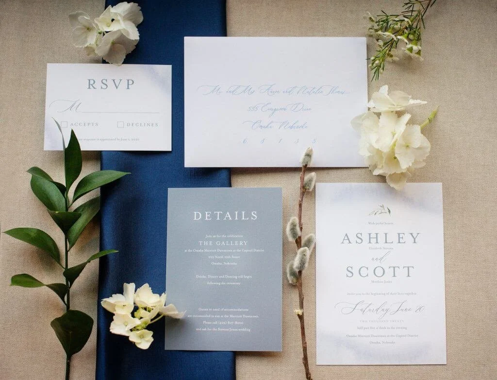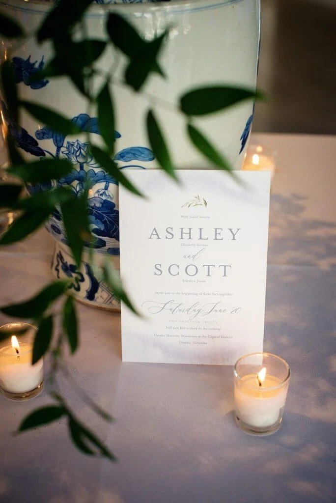I wanted to let those elements speak on their own, so the wedding invitations I designed for this shoot take on just a touch of that blue. I love the simplicity of these invitations and how the script used is minimal. I believe that sets off a classic tone so well.