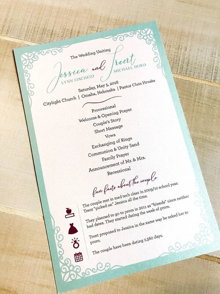 We’re in a neutral world. The color tones I often see for weddings in the past two years have centered on neutral colors…ivory, white, blush, gold. I’ve designed for those weddings and I still honestly love that color palate.But when a couple embraces their own thing, my heart jumps for joy. Mainly because I can work outside of the norm and know that this couple is down for it.Enter in Jessica & Trent. They wanted an elegant and formal look to their wedding but they wanted to embrace that they were getting married in early spring. Their bright turquoise and raspberry colors tones worked so well as the blossoms were in rare form on the budding trees in early May. It’s kinda like they knew spring was going to come a bit late this year and they’d coordinate well with Mother Nature.We designed pocket invitations for Jessica and Trent with pops of their raspberry accent throughout. I love the timeline we created on their ceremony programs as well. He asked her to marry her the same way he asked her to prom….for real, people. Is that a dream or what? And the Thank You notes are perfect with one of their beautiful wedding photos from Daniel Dunlap Photography.In fact, check out all these images from Daniel Dunlap. I don’t think he could have captured this beautiful spring day with this beautiful spring wedding any better.Jessica + TrentMay 5, 2018Ceremony: City Light ChurchReception: Hotel RLDress: Bridal TraditionsBridesmaid Dresses: David’s BridalSuits: Bridal TraditionsPhotographer: Daniel DunlapVideographer: Foster CreativeFloral: Taylor’s FlowersCake: The Cake GalleryTransportation: Nebraska Party Bus & Rockstar Party BusRentals: AAA Rentals