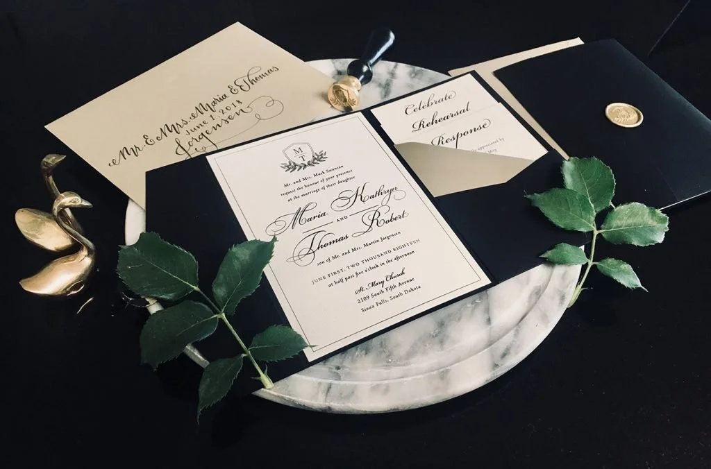Classic style weddings seem to find me. I think it's because it's truly hard to find a beautiful classic wedding invitations that can somehow still capture a personality or individual style.Enter in Maria and Tommy. Their style was just that: classic. But Maria wanted something different to their black & white wedding style. And a pocket invitation was exactly what she was looking for.We designed a beautiful and classic wedding invitation and complimented it with a black pocket. On the invitation, a monogram that we used on a gold wax seal as well. We also designed ceremony programs and place cards with that beautiful monogram.I also got the privilege to design Maria & Tommy's and her mom's Christmas cards this past year. That is the ultimate compliment when a couple tracks me down six months later for more work.Maria & TommyJune 1, 2018Ceremony: St. Mary Church, Sioux Falls, South DakotaReception: Minnehaha Country ClubPhotographer: Ali Kvidt PhotographyHair: Jaci SeversonMake Up: Jilian ArtistryFlowers: Bridget Peterson (family friend)Dress: Rhylan Lang