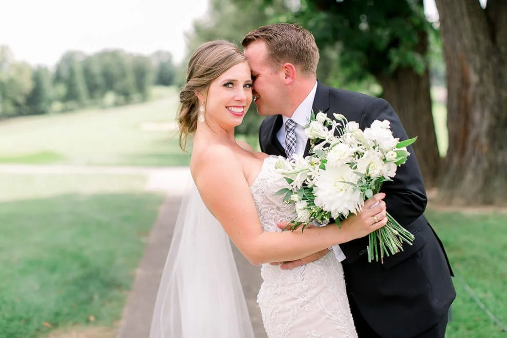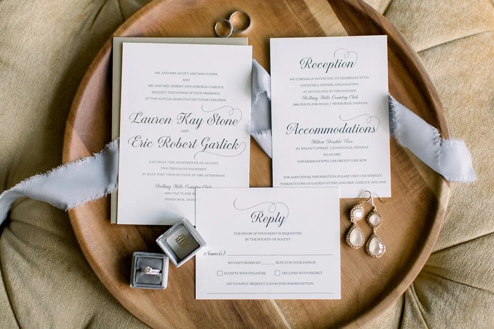 It was 2016 and I was attending the Creative at Heart Conference in Memphis, Tennessee. I sat next to a tall blonde who matched me. I mean, we were both wearing red plaid shirts as if we planned it. Come to find out, this Indiana wedding photographer also just had a baby named Beckett (my youngest son's name as well). Maybe this was fate.We became friends at this conference along with a lot of other women who I am still fans of today. But I didn't know at that time that Morgan's younger sister, Lauren, would be getting married in 2018 and Lauren would not only pick me to design her Save the Dates, but also her wedding invitations. Yep, it was fate.What I loved about Lauren & Eric is that for both their Save the Dates and invitations, they picked designs from my pre-designed package on my online store. And even though you may think you can't really make a design your own with a pre-designed invite, you're totally wrong.Lauren picked my Andra design, which was designed to be black on ivory paper. Lauren changed it up to print a charcoal on ivory paper, which just made the invite look different enough to be gorgeous on it's own. Sticking with just the traditional standard package, we had a details card, RSVP plus envelope printing to go with it.Of course her sister couldn't actually photograph her wedding (since she was standing right next to her that day), but Lauren and Eric's photographer, Meghan Premuda, did an amazing job. I love the light and airy feeling of their wedding and white bridesmaid dresses?!? Totally bringing it back to the Royal Wedding circa 2011. I was in love.Congrats to this wonderful couple and I hope to again sit next to a tall blonde some day for a reunion of Creative at Heart round 8!