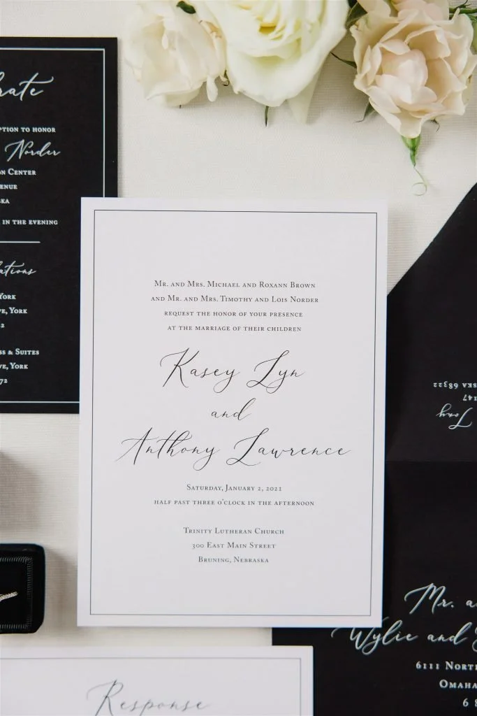 Kasey & Tony's black and white theme was a trend that set the tone for me for 2021 weddings. Simple. Gorgeous. I can't get enough of it. Throw in a black acrylic welcome sign and this couple was hitting on bringing in everything beautiful for their wedding. Oh, and don't forget about some custom signs, place cards and koozies too.