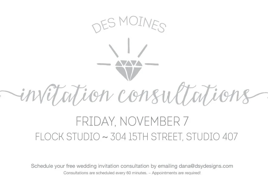 I'll be back in Des Moines for more invitation consultations on Friday, Nov. 7. This is a great chance to sit down and talk about what you are looking for for YOUR perfect wedding invitation, save the date, ceremony program, unique reception pieces, etc. And the best thing is, there is no commitment to purchase anything! After getting to know what you want for your invites, I'll put together a customized quote and then after that, you let me know if you're interested.Still unsure? Check out my reviews on WeddingWire.com. Making couples happy with their invites is my #1 goal.So shoot me an email and let's schedule a time on Friday, Nov. 7 to chat about wedding invites. An appointment is needed and plan on about an hour for the consultation. If Friday doesn't work for you, email me anyway and let's talk.See you Nov. 7!