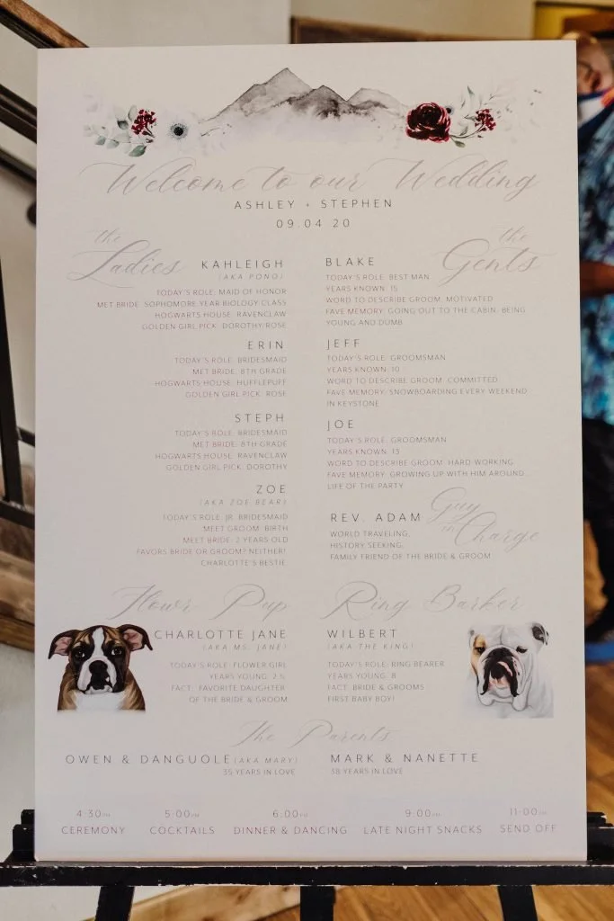 Ashley kept me busy with all the details of wedding day. She wanted to keep every piece consistent and with that, we were best friends. There is nothing I want more! We designed a ceremony board (complete with a portraits of their pups), signs, seating chart pieces, table numbers (with fun facts about their favorite places in Colorado), favor tags and brunch signs for the morning after. When my design proof gets to be past 15 pages, I know it's going to be a good wedding.
