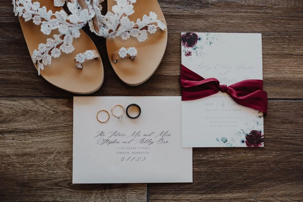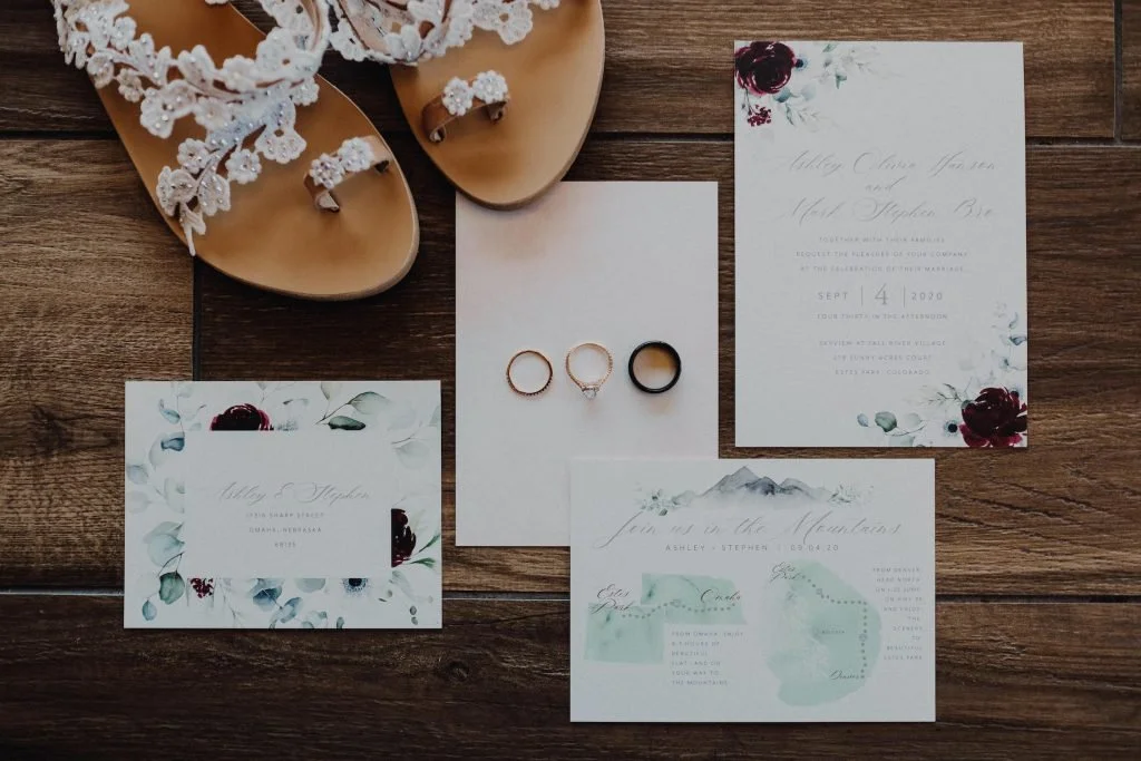 For their wedding invitations, the gorgeous font we used paired with florals with a pop of burgundy were a match made in heaven. And watercolor map for their details card matched the boho vibe perfectly. My favorite part was the burgundy silk ribbon. When a couple wants to bring in color and we don't use a ton of it on their invitations, I love bringing it into an accent piece like ribbon. It was bold and a statement.