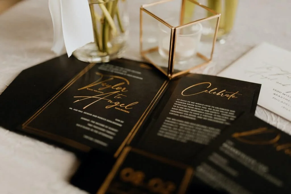 We designed maybe the most amazing invitations this year (okay, I may say that a lot but these are drop dead gorgeous). Black pocket, with black invitations and gold foiling EVERYWHERE. Plus, these invites were wrapped with a black velvet which made this designer's heart happy.
