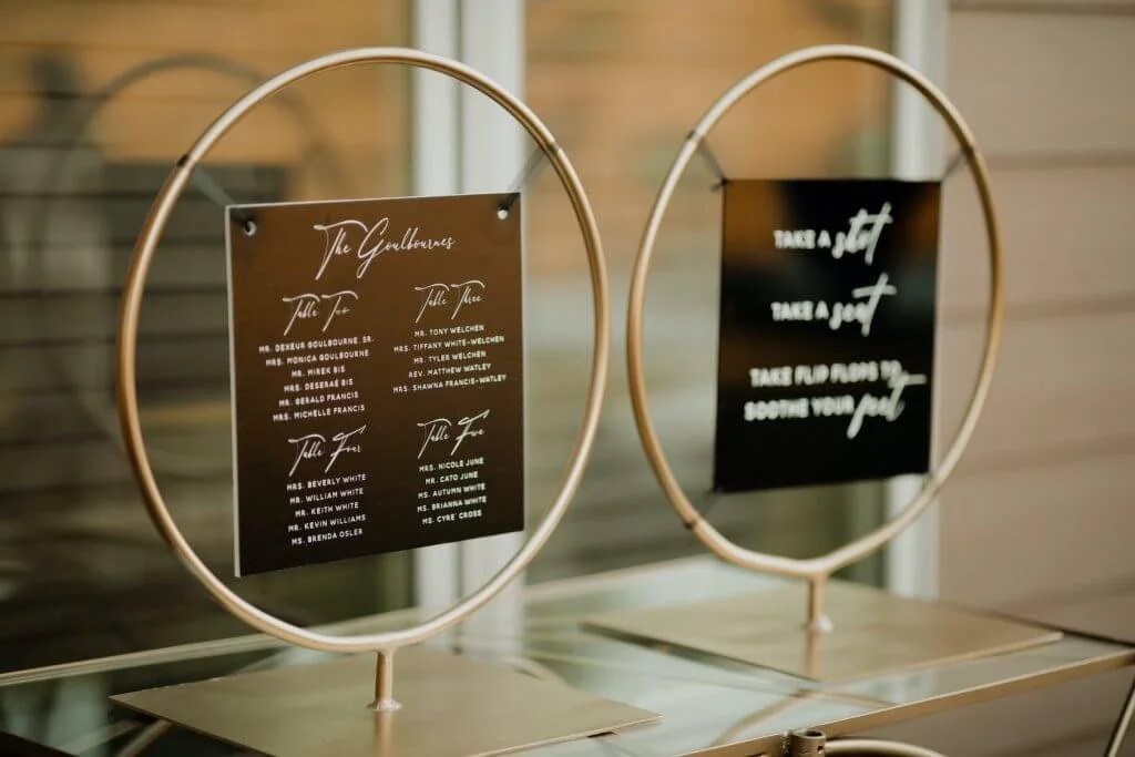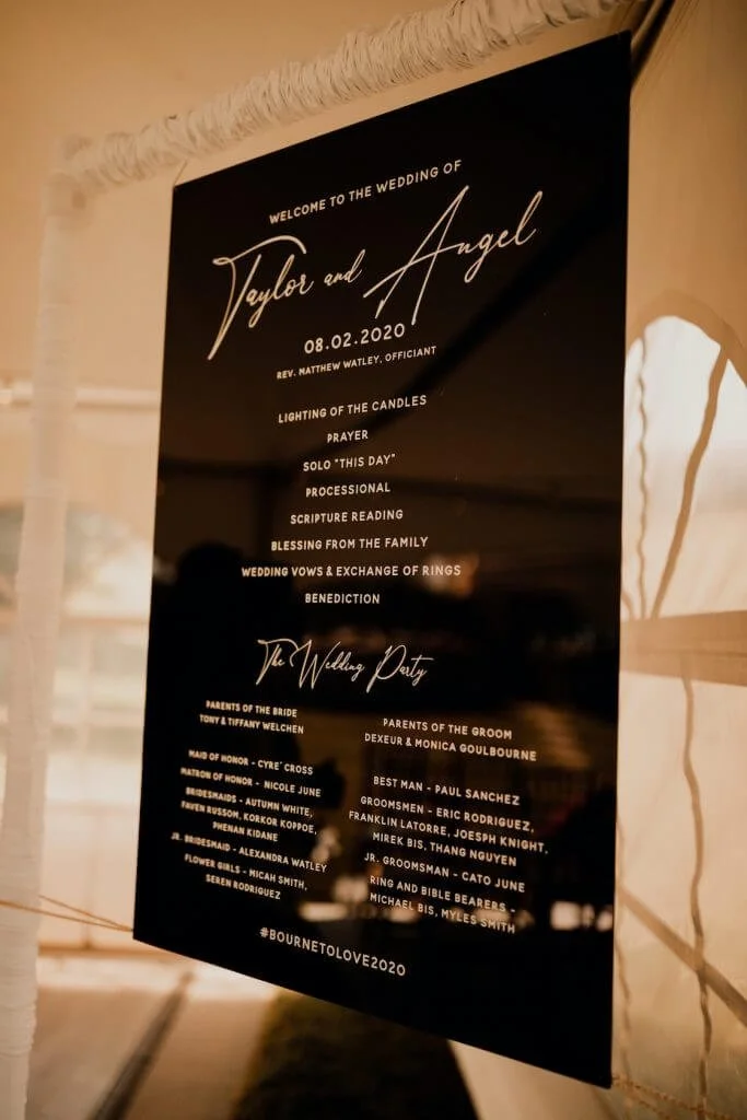 For day of pieces, we put together some fun black acrylic signs, menus, place cards and a ceremony board, also printed on black acrylic.