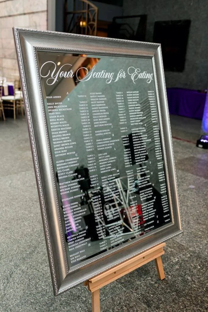 This great couple also let me design pieces for their wedding day. And when I say pieces, I mean everything. And this woman was a happy clam designing a welcome sign, an unplugged sign (my fav), place cards (gold foil on purple paper...yes, please), custom signature drink signs featuring their two cats, other custom signs and my ultimate favorite...mirror seating chart. Oh yes...this was a show stopper again and to see this piece within the Joslyn just made sense. Artwork in an art museum.
