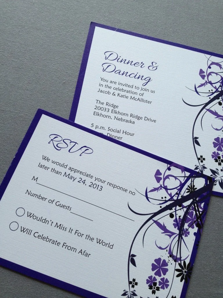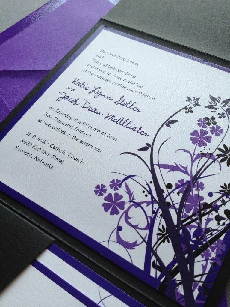 There are last minute brides and there are organized brides. And then there is a category I like to call "Katie". I first met Katie, and her sweet mom, July of last year. In the invitation world, that's a heck of a lot of time to get invitations designed. But, that gave me a lot of time to really create something original for this bride with her purple and black graced wedding.Katie was also one of my first brides to really utilize Pinterest and how a invitation designer can really help create ANYTHING you may find there. Katie would email me a photo and ask "Can we do something like this?". And my answer, "Of course". I'm just going to list some of the things we created for Katie's wedding: