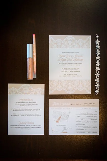 Fourth of July wedding! Awesome! Red, white and blue and fireworks and all the good old fashion America.Well, they had fireworks. And after you see the photos below, you'll agree with me, their style was spot on regardless of the day of the year Kristin and Adam had their wedding on.This couple was so down-to-earth, which is always refreshing (though, many of my couples are this way). As I look back from the notes I took when I met them, my page is only half full. Maybe because from the few words they told me, I knew exactly the direction they wanted to go. Classic. Romantic. Soft. Blush pink. Lace.And beautiful. The invitations we came up with were simple as we incorporated a lace border around the entire invitation. Coming up with that blush pink was a challenge but by the time wedding season 2014 was over, I had it mastered. What I absolutely loved about their invitation package was their RSVP. This couple had a lot of great ideas. A lot of fun ideas. And they wanted to incorporate them all. No problem. We incorporated a "Where are you coming from?" map, a "How much will you eat and drink" chart for guests to fill in as well as a mad libs section so people can give their best adjectives and verbs to let Kristin & Adam know if they are coming or not. As Kristin told me, she wanted her guests to open up this beautiful invitation but then see this fun RSVP and know exactly what kind of fun they were going to have.Bingo.Thank you to this wonderful couple for allowing me to design for your wedding day. From the photos below, it was a beautiful time! Wishing you a lifetime of happiness!Kristin + AdamJuly 4, 2014Ceremony: UNO Thompson CenterReception: DC CentreBridal Gown: Suburban BridalMen's Formalware: Men's WarehouseHair & Makeup: Reveal SalonPhotographer: Tin Box WeddingsVideographer: Matt Kelly, family friendFlorist: Flowers for Special OccasionsCake: HyVee, 180th & QMusic: DJ Dave StutsmanInvitations & Stationary: dSy invitations