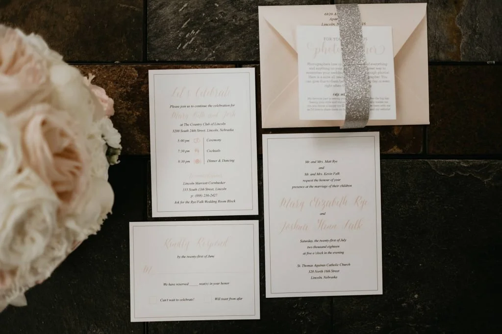 When I rebranded last year, I wanted to do something big to celebrate. I threw around a few ideas but I couldn’t pass one that kept jumping out at me. I’ve never done it before, but if I were going to, this was the time.Enter in my Biggest Giveaway Ever where I gave away one invitation suite for free. One hundred percent no strings attached free. Of course I made couples apply and jump through a few hoops (including the groom sending in a video about why his fiancé is “the one’) . Only a few couples made it through all the hoops and out of a random draw, Mary Beth and Josh ended up my winners.And man, did I have fun with this contest and designing for these two. I’m pretty sure Mary Beth and I chatted for 2 hours when we first met…if not more. I just loved their soft, blush, traditional style they were creating for their wedding day. She was so on-point for what is hot right now, yet they had their own look which I loved.We designed wedding invitations with a traditional layout using a calligraphy inspired font. Blush was the main color on these and we brought that in to the envelope as well as hints throughout the invitation pieces. Throw in a few gold foil table numbers and signs and this couple pieced together a perfect wedding.Congrats to my lucky couple and thank you for letting me design for your wedding day. I hope the "luck" continues throughout your marriage!Mary Beth + JoshJuly 21, 2018Ceremony: St. Thomas Aquinas Catholic Church, LincolnReception: The Country Club of LincolnDress: Ready or KnotMen’s Wear: Mr. TuxedoPhotographer: Ben RamosFloral: Petals to PlatinumCake: Cindy’s CakesTransportation: Tailored DreamsHair: Emily Huttes, H Salon & Day Spa, HickmanMakeup: Flawless Makeup by Katie Keister