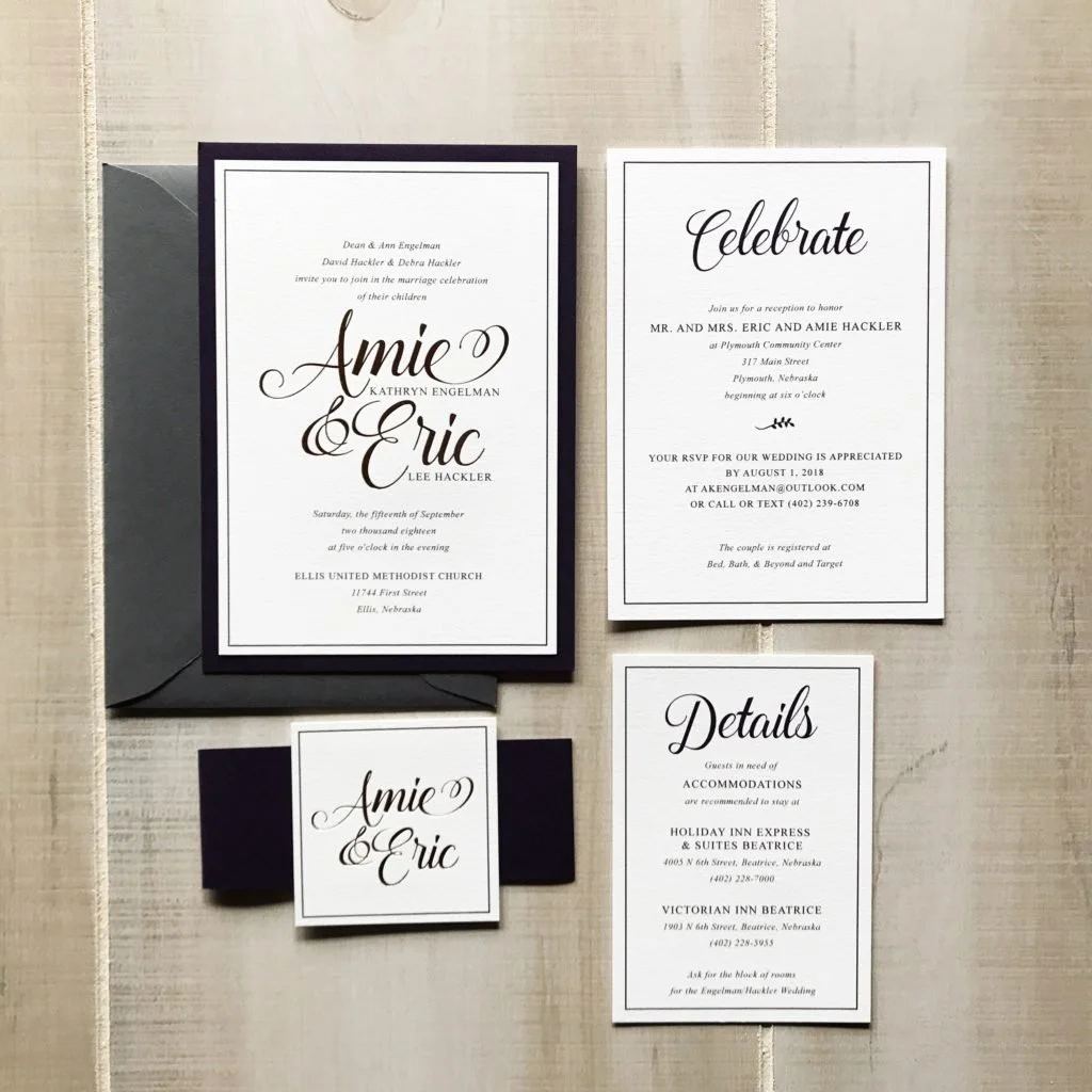 I rarely sit down and chat with one of my couples after their wedding day. Life happens and if I stay in touch over social media, I figure I’m doing good. But I had a chance to catch up with Amie & Eric when they volunteered to help me with one of my own projects.I recently had some photos taken for my business and I wanted a couple to be in my photos, so I can show how I interact with couples and what an invitation consultation looks like. Amie & Eric were so generous to help me out and I loved talking with them about their wedding day—how fast the day went, how Eric got hit in the head the day before the wedding and about needed stitches (he turned out alright), how glad they were to take their honeymoon right after the wedding—it was so much fun to chat with them!And during our faux consultation, we looked at their invitation and it was fun to remember how the pieces for that design fell into place. I knew we had to bring in rose gold into their invites and what we came up with was gorgeous. Along with the invitations, we also created Save the Dates, ceremony programs, koozies and cute little sticky note pads!What was really gorgeous was their wedding day. The outdoor ceremony was in Ellis, Nebraska at a small, country church. Seriously….these photos should be in some Midwest wedding magazine because it is #weddinggoals.Amie & EricSeptember 15, 2018Ceremony: Ellis United Methodist ChurchReception: Plymouth Community CenterDress: Ellynne BridalMen’s Wear: Tip Top TuxPhotographer: Adorn PhotographyVideographer: Complete Weddings & Events (Lincoln)Floral: Tied + TrueCake: Lora CushingCaterer: Lefty’s CateringRentals: U R InvitedTransportation: A-Z Transportation