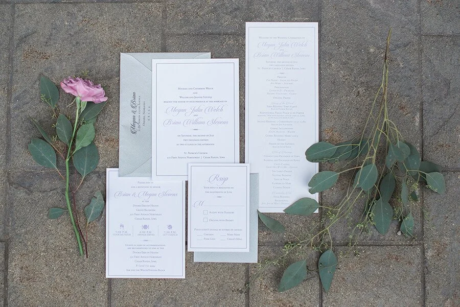 Two years ago my family and I moved to Cedar Rapids, Iowa. During that time, I kept my wedding invitation business going in Omaha as well as expanded into Des Moines and Cedar Rapids. My Omaha and Des Moines bookings were excellent. But that darn city of Cedar Rapids was a puzzle to me. A year after we moved there, we moved back to Omaha.Enter in Megan. "I'm getting married in Cedar Rapids." Well hello FIRST Cedar Rapids bride. I guess I had to live in Omaha again to book a bride actually getting married in CR! It was fun to chat with Megan about the city, where they're getting married and the Iowa vendors she's using for her big day. And the wedding suite we designed is so classic, so beautiful. It's simplicity is something I personally love, which made it easy for me to design.For Megan and Brian's wedding, we designed her invitation package, ceremony programs, super cute "Mint to Be" mint wrappers, water bottle labels for a hot July day (but record lows that day!!) and thank you notes.Congrats to this wonderful couple. Wishing you a lifetime of happiness!Megan + BrianJuly 2, 2016Ceremony: St. Patrick's Catholic Church, Cedar Rapids, IowaReception: DoubleTree by Hilton, Cedar RapidsPhotographer: Stacie Ricklefs Photo + DesignDress: Hope's BridalTuxes/Suits: Men's WarehouseFlorist: Studio BloomCake: HyVee (Johnson Ave)Videographer: Pro Video ProductionsDJ: Crown EntertainmentHair: Fix SalonTransportation: Black Diamond LimousineInvitations & Stationary: dSy invitationsSaveSave