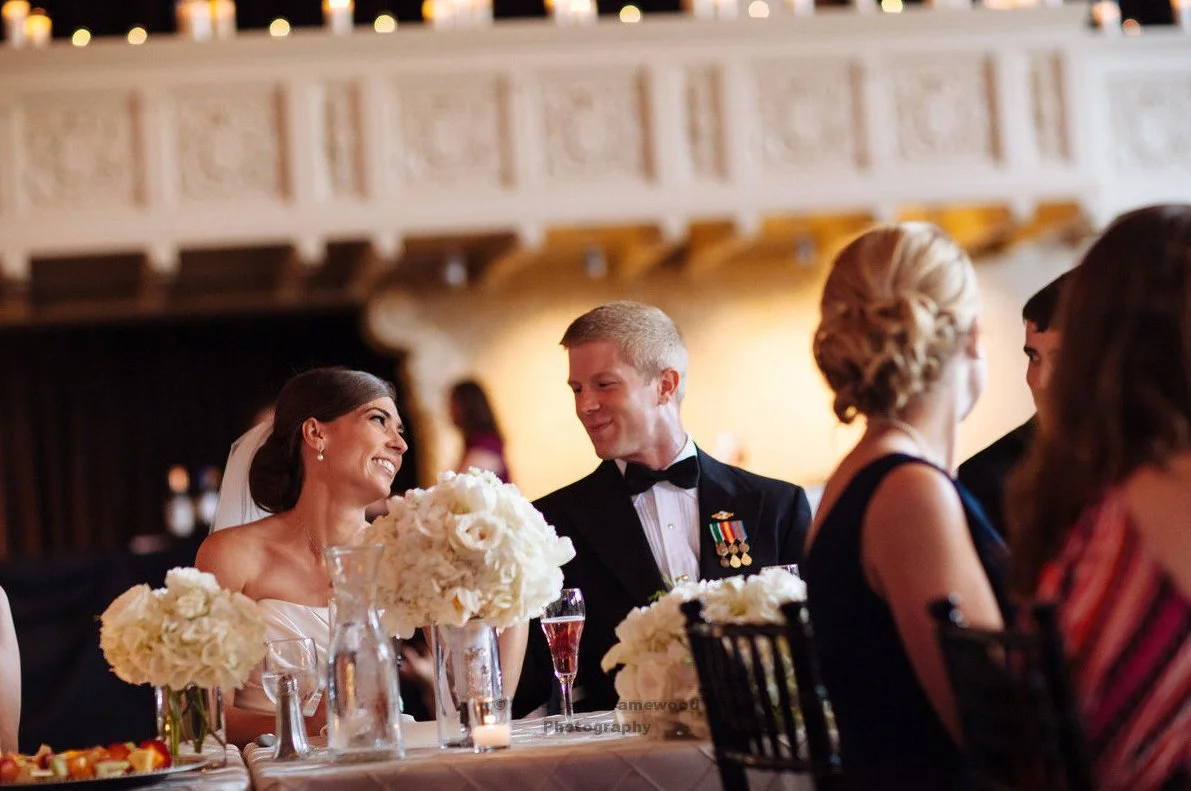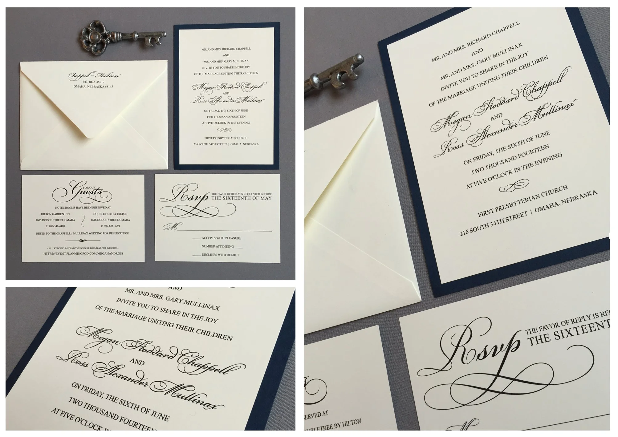 When I see photos of Megan and Ross's wedding, I can't help but think this is the type of wedding Megan had been dreaming about since she was 7 years old, or whenever little girls start dreaming about their wedding. Beautiful bride, handsome groom, large beautiful church and every last detail was elegant perfection.And that's how I envisioned it too when I first met Megan, her mom and mother-in-law early 2014. Megan wanted nothing but classic in every element. Her invitations were designed with exactly that in mind...and trust me, classic elegance may look easy, but is definitely not that. We wanted to show that classic look Megan was searching for, but make it their own too. Their invitations were black on ivory with a second layer of a navy blue linen paper adhered to the back. This gave the invite substance and that little bit of color Megan had throughout her wedding day. The RSVP postcard and guest information card were both beautiful. We printed all guest names and addresses on the envelopes to round out the entire package.For wedding day, we created a folded, classic wedding ceremony program as well as a long skinny menu that gave the table a pop of shine with the cream metallic paper it was printed on.Such a great couple and I loved working with them. Congrats...wishing you a lifetime of happiness.Check out Megan & Ross's wedding video here (by JF+M)Megan + RossJune 6, 2014Ceremony: First Presbyterian Church, Omaha, NEReception: Scoular BallroomWedding Planner: Kimera Weddings and EventsPhotographer: Dana Damewood PhotographyVideographer: JF+MFlorist: Flowers by DesignCake: Cake GalleryBand: Rough CutInvitations & Stationary: dSy invitations