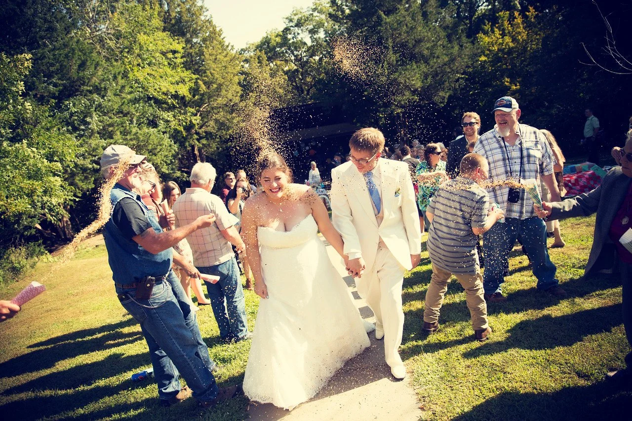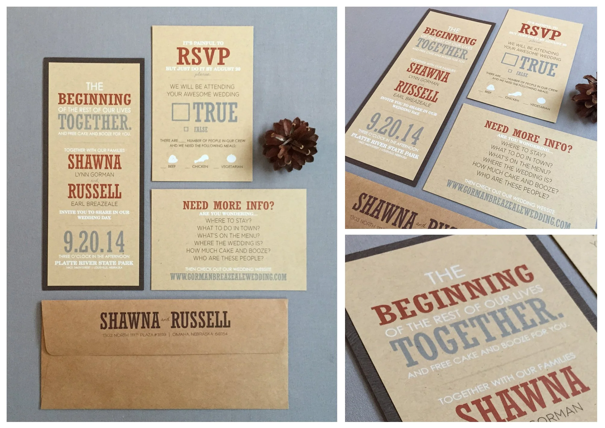 I recently blogged about an Omaha couple (Megan & Ross) who had a beautiful church/city style wedding. It was elegant and beautiful. The same time I was blogging on Megan I got an email from Shawna, a bride who got married this past Fall. And I couldn't help but just laugh to myself and was reassured why I love doing what I do.Shawna and Russ's fall wedding at Platte River State park was everything opposite of the church/city style wedding I was blogging about. And the thing is, they were both for the same purpose but their styles were both so unique. It's awesome how two different couples can have completely different looks but the end result is always the same (marriage). And from my perspective, there is nothing better than having such a broad spectrum to design for.And Shawna and Russ gave me no limitations. In fact, they challenged my creativity and made me go to limits I don't usually get with wedding invitations. I mean, who uses the word "booze" on their wedding invitations? These guys do! Which is brilliant because it goes with who this couple is. From the first time I met them, I knew this was going to be fun. Shawna and Russ were laid back, chill and just wanting something sweet to send out to guests.And we did that with some Save the Date magnets that boldly said their names and location. That's about it. And their invites...definitely a talking piece at wedding shows I'm currently doing. We printed their skinny invites on craft paper and backed it with a dark brown, wood grain textured paper. Their RSVP was simple (if you were replying yes to coming) and their guest information card made sure to tell their guests there was no skinny dipping in the pond nearby. We also did Thank You cards which showcased their great photos from the day.I'm not sure if I'll find another couple quite like this. If I do, I'm going back to these invites to remind myself that for today's weddings, anything goes.Congrats, Shawna & Russ. Wishing you a lifetime of happiness.Shawna + RussSeptember 20, 2014Ceremony & Reception: Platte River State ParkPhotographer: Royce StudioInvitations & Stationary: dSy invitations