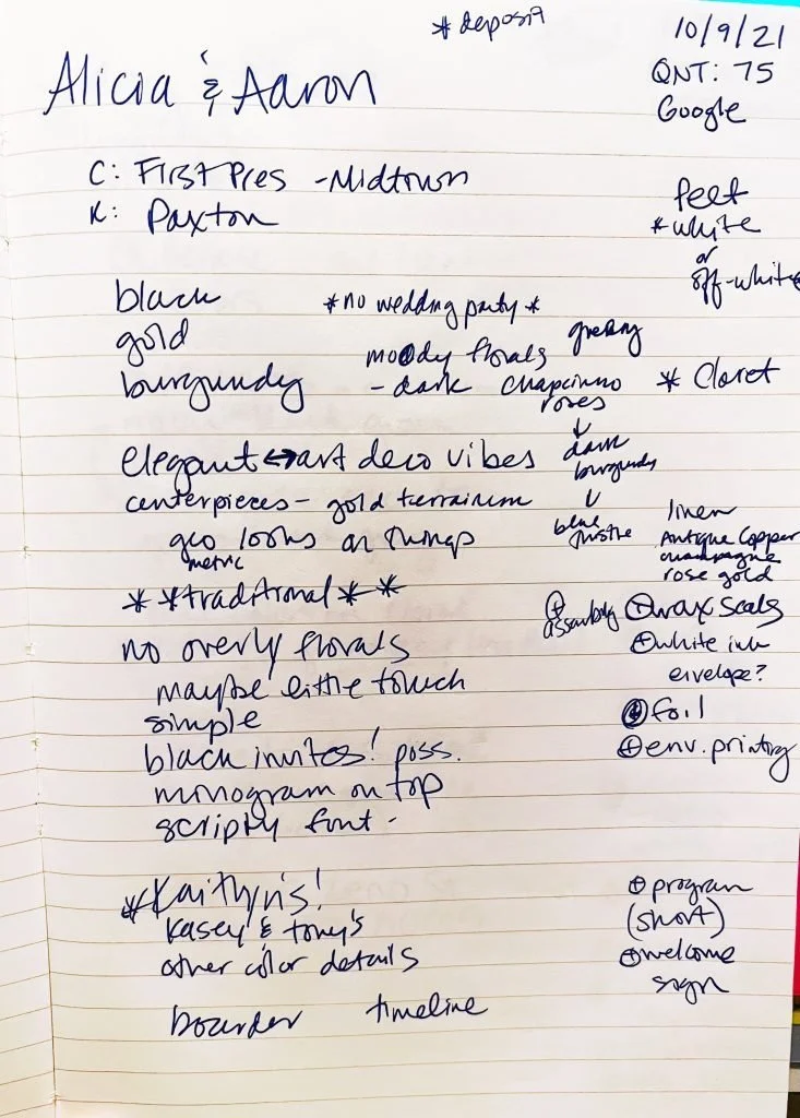 It's true sometimes. When we talk at your first consultation, you're telling me about what you envision your wedding to be. I ask questions, take notes and then honestly, things start falling into place for me. Are you traditional? Tell me about your florals. Where is the wedding at?